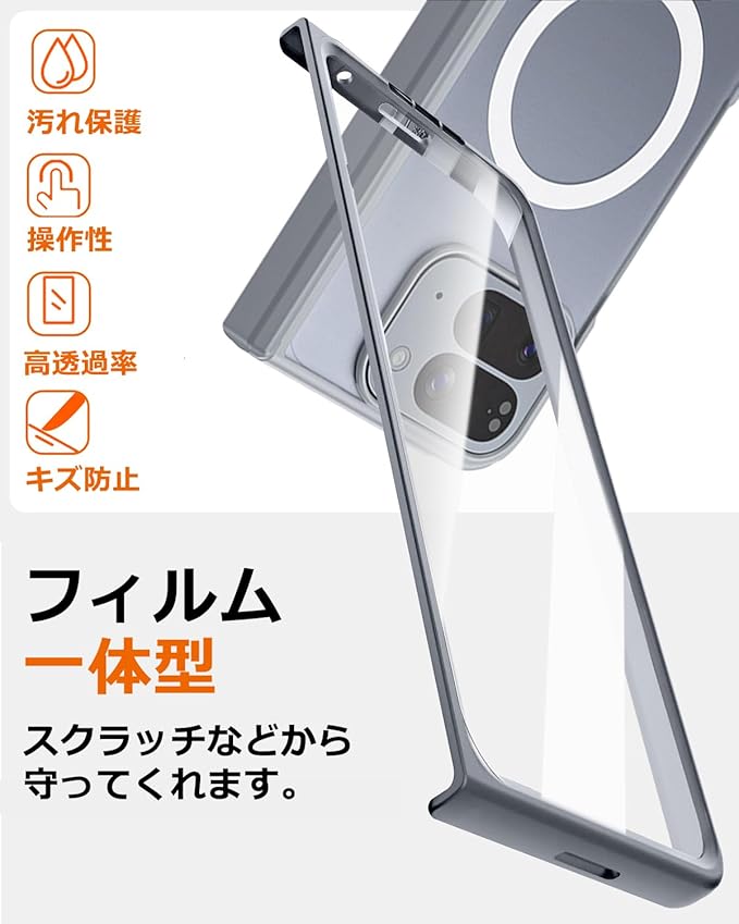「マグセーフ対応」:背面にワイヤレス充電器、スマホリング、スマホカードケース、などの全てのMagsafeアクセサリーに対応します。