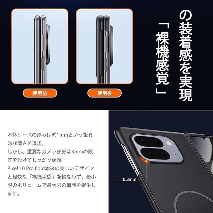 【驚異の薄さ「1mm」で「裸機感覚」の装着感を実現】本体ケースの厚みは約1mmという驚異的な薄さを追求。しかし、重要なカメラ部分は3mmの段差を設けてしっかり保護。Pixel 10 Pro Fold本来の美しいデザインと軽快な「裸機手感」を損なわず、最小限のボリュームで最大限の保護を提供します。