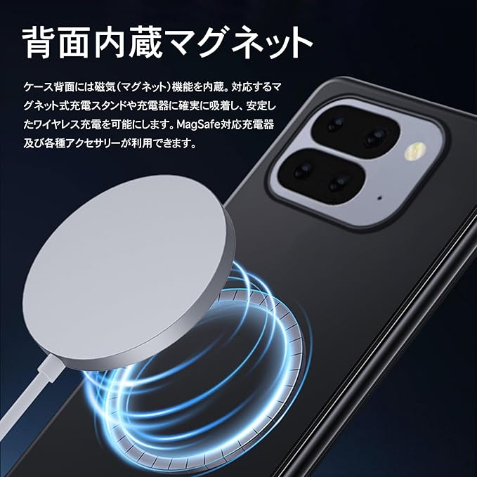 【背面内蔵マグネットでMagSafe対応充電器にしっかり吸着】ケース背面には磁気(マグネット)機能を内蔵。対応するマグネット式充電スタンドや充電器に確実に吸着し、安定したワイヤレス充電を可能にします。MagSafe対応充電器及び各種アクセサリーが利用できます。吸着力を高めて、安定感をアップしてエネ損失なしの快速ワイヤレス充電できます。