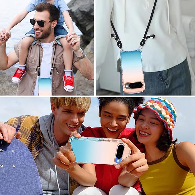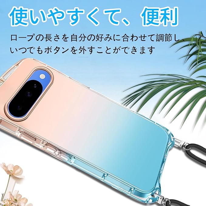 Google Pixel 10 用の ケース ショルダー ストラップ グラデーション Pixel 10 Pro 用の カバー 斜めかけ 肩掛け 韓国 ピクセル 10 / 10 Pro スマホケース ライトブルー/オレンジ