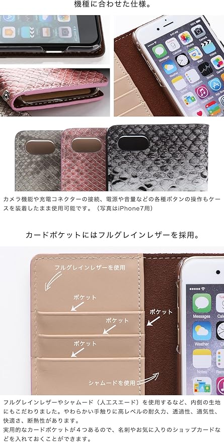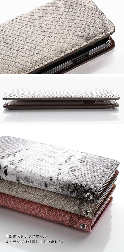 外側カバーはパイソン(大蛇柄)のPUレザー、内側カードポケットをフルグレインレザーで製作したハイブリッド(PUと本革を一体化させた)手帳型スマホケースです。傷や汚れに強いのが特徴です。ベルトが付いていないので片手でラクに開閉でき、マグネット不使用のため磁気カード等の影響も心配ありません。前面カバーは使用しているうちに馴染み、次第に閉じてくるようになります。