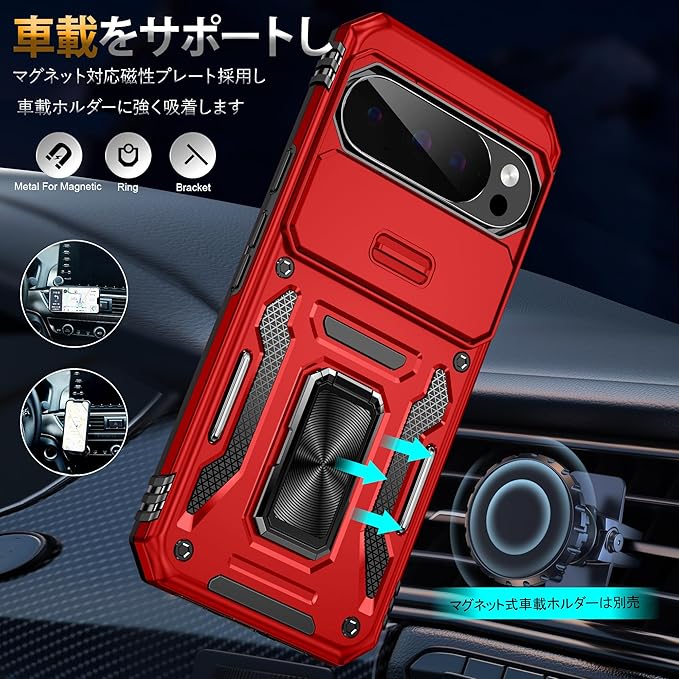 Google Pixel 10/10 Pro 対応 ケース リング付き スライド式カメラカバー 耐衝撃 スタンド機能 車載ホルダー レンズ保護 ピクセル10/10 プロ 対応 スマホケース PC TPUバンパー 防塵 人気 落下防止 滑り止め 指紋防止 携帯カバー 赤 K355