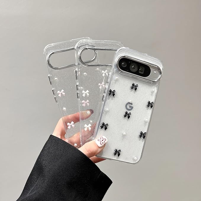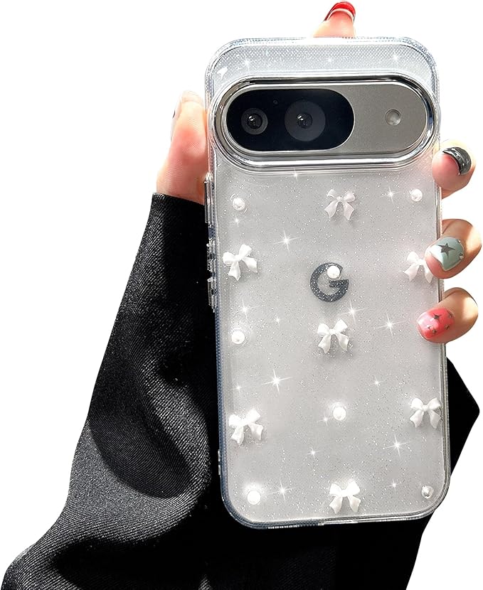 EYZUTAK ケース 対応 Google Pixel 9/9 Pro/10/10 Pro 用の 保護ケースおしゃれ 可愛い 韓国 クリア りぼん立体感装飾 きらきら ラメ入り 透明TPU薄型 軽量 耐衝撃 擦り傷防止 保護カバー - ホワイトのリボン