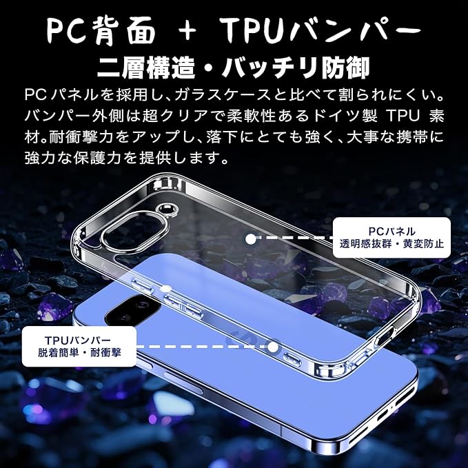 【極上の透明感・黄変防止】ケースは透き通った99%高い透明度を誇り。驚きほどの透明感、美しさをしっかりキープ、Phone本体のカラーを活かせて、背面がクリアなので好きなシールや写真を入れてカスタマイズOK。Phone本体の美しさを引き立たせて端末を衝撃と傷から保護します。ピクセル 10a 用ケースは黄ばみに強いソフトTPU素材と耐候性に優れたPCパネルを厳選し、研究データにより、黄変耐性が普通製品より20倍も高く、従来手法よりも88%の黄変防止を達成した。経年劣化による黄ばみも生じないから、澄み切った光沢感は、人を惹きつけてやみません。