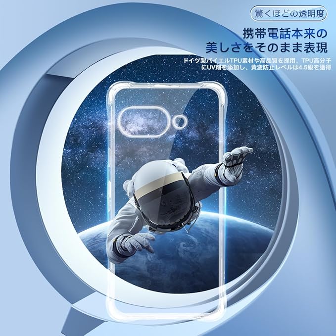 【黄変防止強化材質 驚くほどの透明度】ドイツ製 TPU 素材(バイエルン産)を採用しており、TPU に UV 剤を添加することで、黄変防止性能が JIS 規格 4.5 級に達しています。スマホを長時間使用しても、光沢感を維持できます!背面の光透過率は 99% に達し、透き通った高い透明度を誇ります。対応 ピクセル10a 本来のデザイン美を損なわず、洗練された外観を引き立てます。