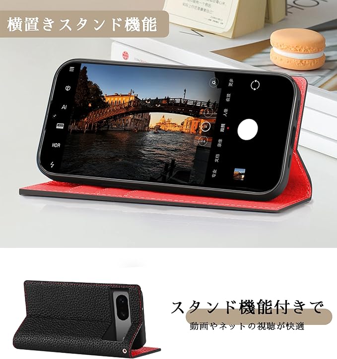 CLICSUN Google Pixel 7 対応ケース 高級 牛本革 Pixel 7 対応ケース 手帳型 グーグル ピクセル 7 対応カバー 本革 レザー カバー 全面保護 衝撃吸収 スタンド機能 ストラップ付き マグネット式 カードポケット ギフトボックス付き ブラック レッド