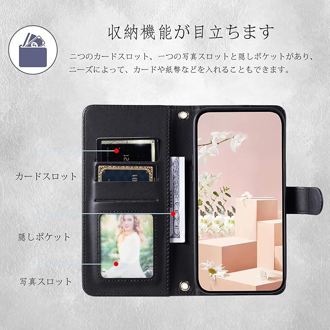 【手帳型ならではの機能が満載】クレジットカード、交通カード、キャッシュなどを収納できると共に、スマホのレンズ及び液晶を全面的に保護できます。商品の内部ケースは柔軟のTPU材料を使用している為、スマホ本体を保護することができます。各機種にピッタリの専門設計なので、ケース装着時も、カメラ、電源ボタン、音量ボタン、イヤホンジャック、コネクタ等がそのまま使用可能です。また、スタンドモードにもなる為、好きな角度で動画鑑賞や読書などを楽しめます。