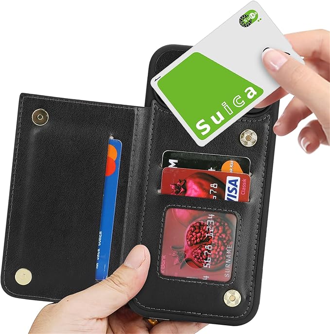 【カード収納】カバーの内側と裏面にお札ポケットとカードスロットを搭載して、カードや名刺やお札などを入れることができます、外出するのに便利です。磁気的に適度なボタンもあります、開閉するのに非常に便利です。