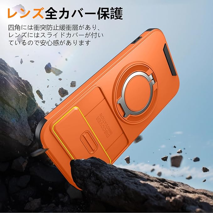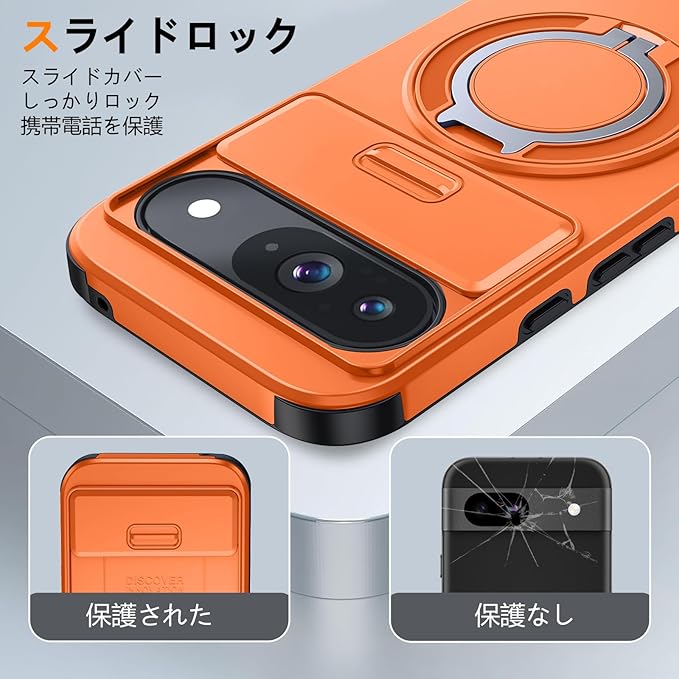 Google Pixel 9 用 ケース リング付き スライド式カメラカバー 隠しスタンド Google Pixel 9 Pro 用 ケース 耐衝撃 スタンド機能 縦横両対応 車載ホルダー PC TPUバンパー 防塵 人気 落下防止 滑り止め 指紋防止 ピクセル 9/ピクセル 9 Pro カバー オレンジ MJJ-1065-05-06