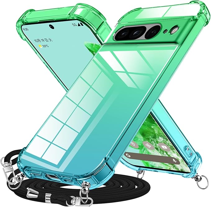 Duluqboba ケース 対応 Google Pixel7 Pro 用の ケース クリア ショルダー ストラップ グラデーションカバー 紐付き 肩掛け 斜めかけ 対応 ピクセル7 プロ 用の 縄掛けカバー 耐衝撃 TPU エアクッション 取り外し可能 調節可能な 透明 薄型 軽量 ネックストラップ 落下/紛失防止 ワイヤレス充電 可愛い グリーン AYS-8-50
