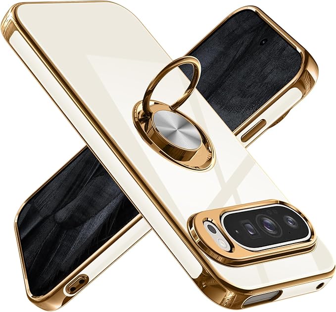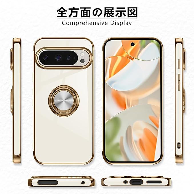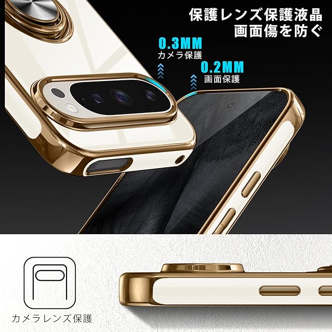 Google Pixel 9 Pro XL 用ケース リング 耐衝撃 レンズ保護 軽量 グーグル ピクセル 9 pro xl 用ケース メッキ加工 ソフトケース スタンド機能 車載ホルダー対応 サラサラ触り心地 白 MZ85-61