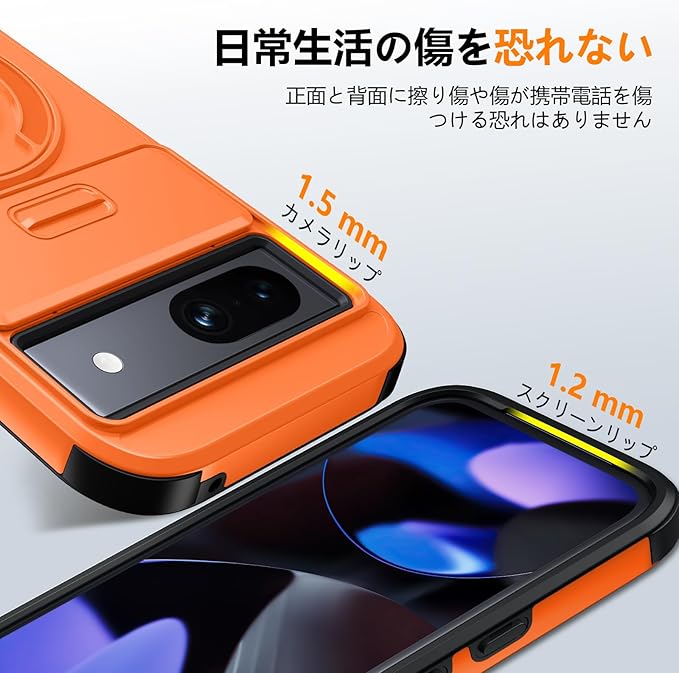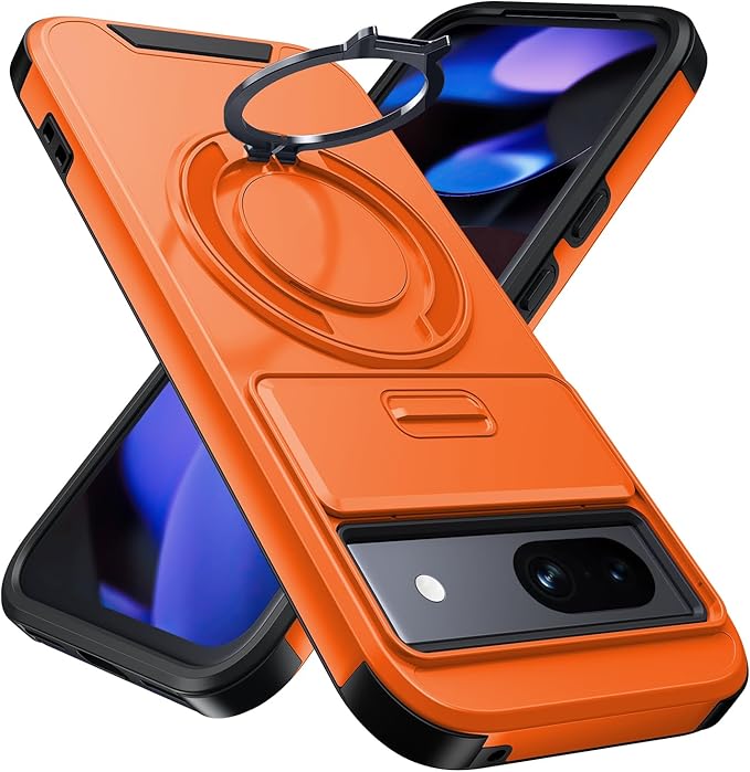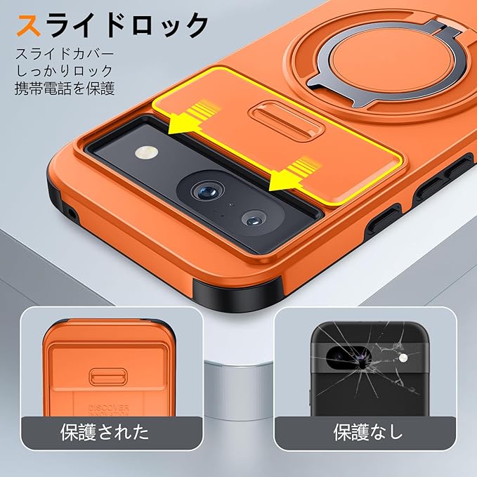 対応 Google Pixel 8A 用 ケース リング付き スライド式カメラカバー 隠しスタンド 耐衝撃 スタンド機能 縦横両対応 車載ホルダー PC TPUバンパー 防塵 人気 落下防止 滑り止め 指紋防止 ピクセル 8a カバー オレンジ MJJ-1065-06-08