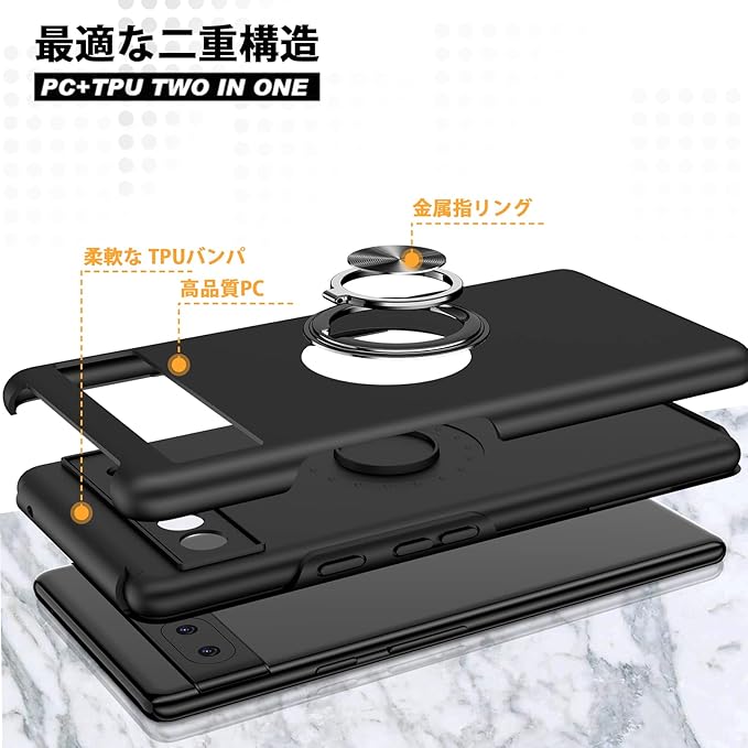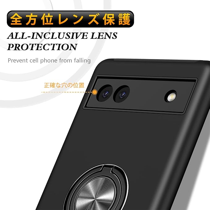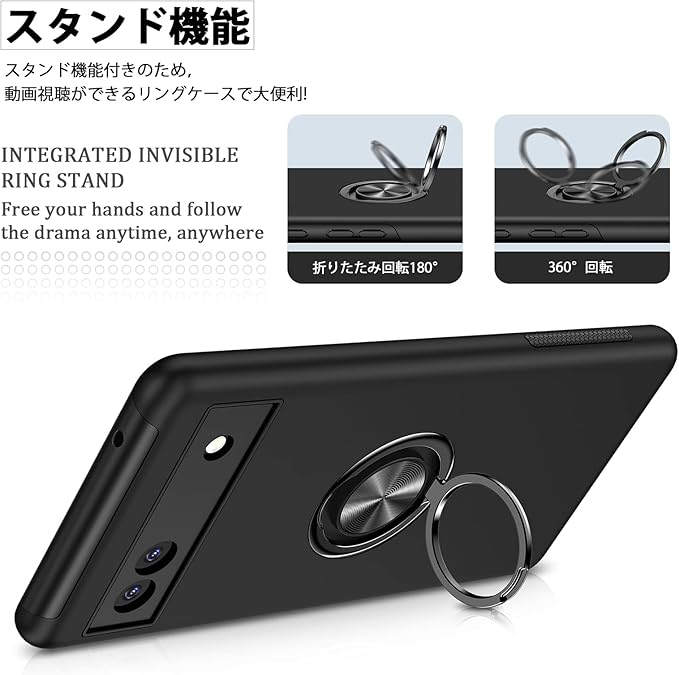 対応 Google Pixel 7A 用の ケース リング 耐衝撃 米軍MIL規格取得 TPU+PC 衝撃吸収 カバー レンズ保護 リングつき 指紋防止 360 回転 車載ホルダー対応 スタンド機能 防塵 薄型 落下防止 擦り傷防止 携帯電話カバー 黒C85-APixel7a-03