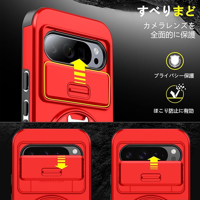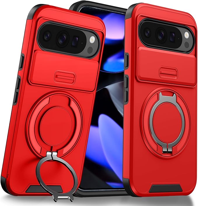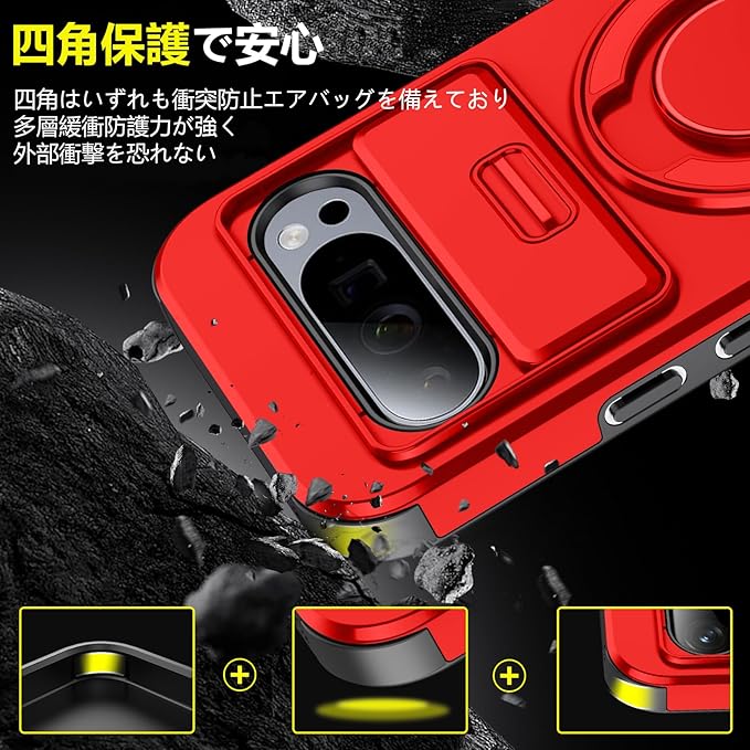 対応 Google Pixel 9 用 Pixel 9 Pro 用 ケース スタンド付き 耐衝撃 レンズ保護 スライドカメラカバー TPU+PC 軽量 滑り止め 落下保護 スタンド機能 車載ホルダー対応 ピクセル 9/ピクセル 9 Pro 携帯ケース 赤 R-LK-Pixel9-9Pro-03