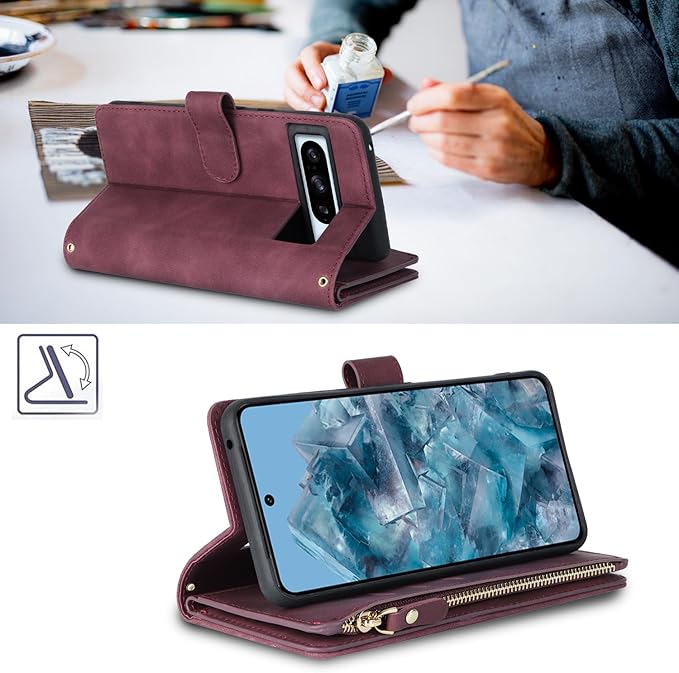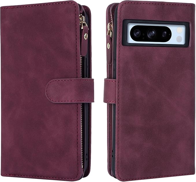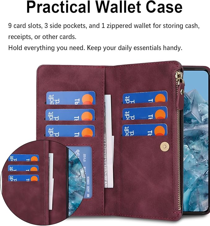 Pelanty for Pixel 8 Pro 縄掛けケース手帳型 携帯カバー 肩掛け斜めがけ ショルダー 合成皮革+TPU マグネット 財布型カバー ICカード お札入れ小銭入れ大容量 収納ポケット スタンド機能 グーグル ピクセル8pro 6.7インチ ストラップ付き 落下防止 耐衝撃 全面保護(肩縄付き-ワインレッド)