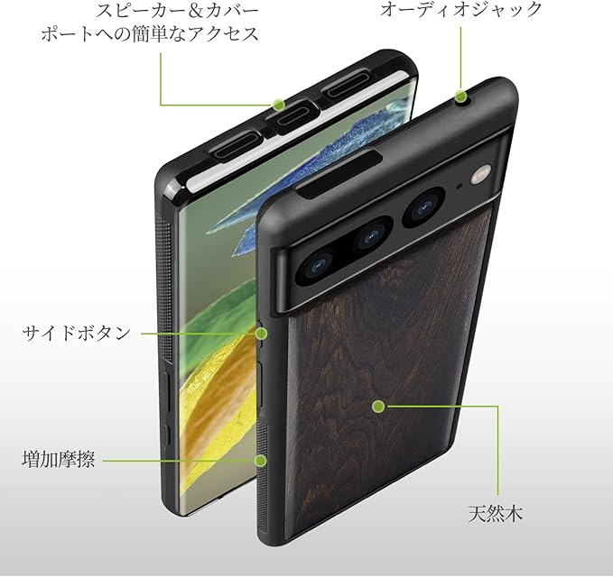 「製品構成」軽量で保護機能を兼ね備えた木製のスマホケースです。合成木と高品質のソフト TPU(熱可塑性ポリウレタン)をベースに作られており、美しい外観だけでなく、保護機能も優れています。美しい木目が個性を際立たせます。製品を受け取った時、その独特で自然な美しさを感じることができます。