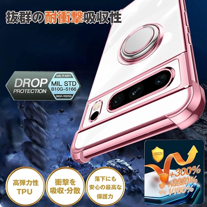 Google pixel 8 pro ケース クリア リング付き 耐衝撃 柔軟 軽量TPU 透明 薄型 レンズ保護スマホ 落下防止 滑り止め、すり傷防止 360 回転 スタンド機能 車載ホルダー対応(ローズゴールド)