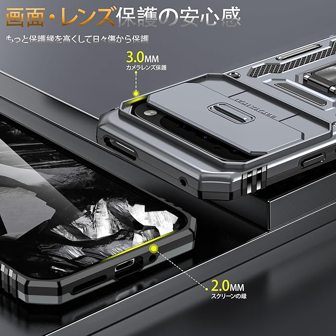 【機種対応】対応 Pixel 9 Pro XL 6.8インチ Pro 用のデザインです、他用の機器と互換性がない。【二重構造】PC(ポリカーボネート)バック+TPU(シリコン)バンパー+金属ホールリング、内側TPU素材とハードPCフレームで制作するため、耐久性に優れた、外部からの衝撃を内部に吸収されて、側に滑り止めの設計で、落下を防止にできます。全カバー式の音量ボタン&スイッチボタンの設計は、ぴったり合うだけではなく、操作しやすいよう最も適したサイズに作られています。【スライド式カメラカバー】スライドカバーはより滑らかに開閉できるようになりました。カメラレンズもスライド式カバーで砂・埃などの侵入を防ぎます。ケースのエッジは液晶画面より高さの設計で、液晶画面を保護することができます。【スタンド機能】スタンドの機能はスマホを横に放置できて、長時間の動画視聴でも手に持つ必要がなく、超らくらく動画視聴が可能です!長時間での新幹線、飛行機の中での暇つぶしに最適ですよね。携帯ケースと指リングは一体型な設計で複雑な取り付けがなく、落下しにくく、擦り傷、ぶつかり合う、落下からスマートフォンを保護することができ、手に持って持ち運ぶことも安全&便利です。車載の磁気吸盤にしっかりと吸着することができ、運転中に携帯電話のナビゲーションなどの機能をより便利に使用することができます。(ご注意:ケースの背面は金属製部分がありますので、ワイヤレスチャージャーを使うことときにカバーケースを取り外してください。USB lightning ケーブルで充電するならOKです。)【カラーバリエーション】豊富なマルチカラーラインナップ!シンプルなベーシックカラーからポップなアクセントカラーまで、あらゆるスタイルとシーンに合わせてお選びいただけます。日常の気分やお好みに合わせて、自由にコーディネートできる楽しさをご提供します。