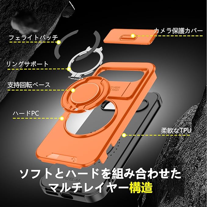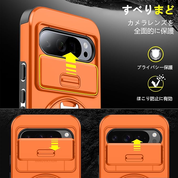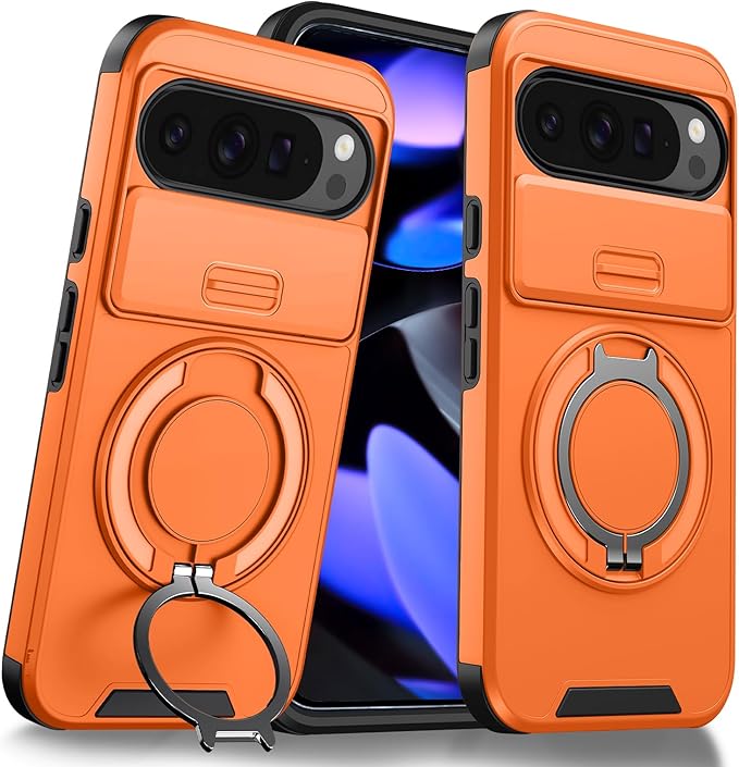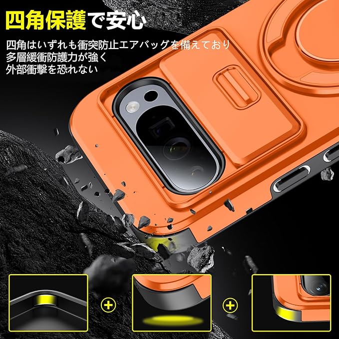 対応 Google Pixel 9 用 Pixel 9 Pro 用 ケース スタンド付き 耐衝撃 レンズ保護 スライドカメラカバー TPU+PC 軽量 滑り止め 落下保護 スタンド機能 車載ホルダー対応 ピクセル 9/ピクセル 9 Pro 携帯ケース オレンジ R-LK-Pixel9-9Pro-06-CP