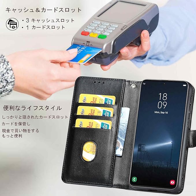 【カード収納】内側には3つのカードスロットと1つのキャッシュポケットがあります、名刺や定期券の収納に優れォン ケースです。普段の生活に便利をもたらします。