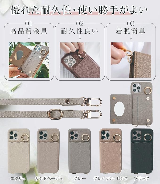 商品特徴◎ケース ショルダー ストラップ付き ◎マグネット止め、開け閉めが便利! ◎3枚カード収納可能。便利な指穴があり、カードの取り出しが簡単。 ◎ケースに鏡付き ◎スタンド機能有り ◎カラビナリング付き、落下防止