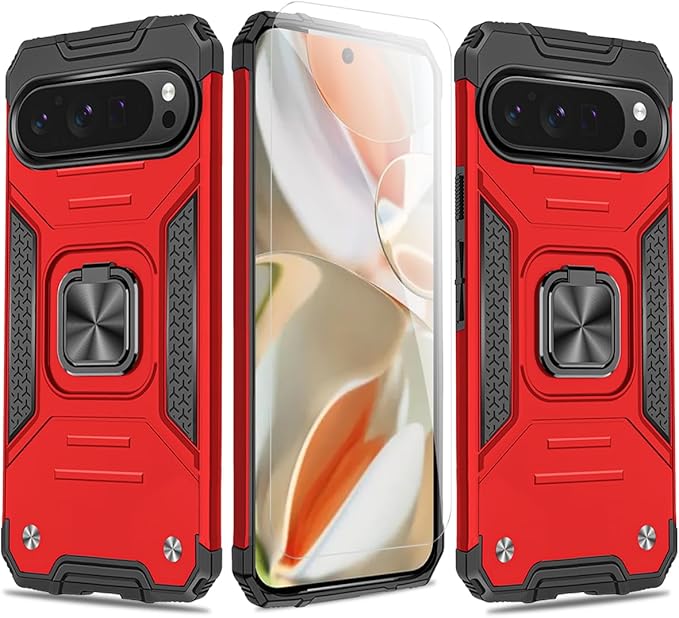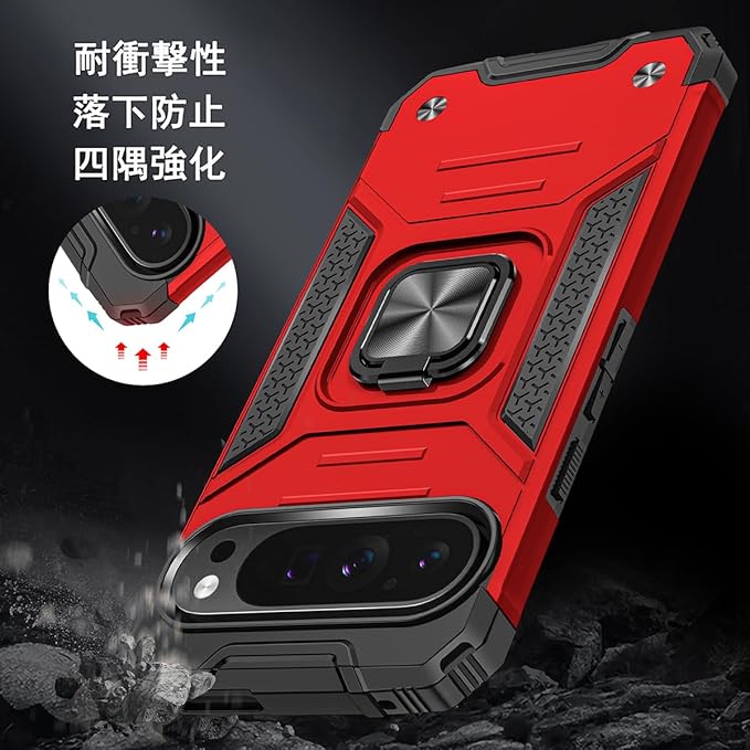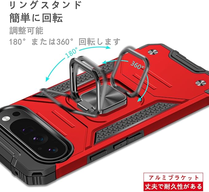 JSCOMYAP Google Pixel 9 / Pixel 9 Pro ケース用, ピクセル9 スマホケース + ピクセル9pro 强化ガラス フィルム,リング スタンド機能 付き 携帯ケース 人気 耐衝撃 横置き機能 Case Cover ぐーくるぴくせる グーグルピクセル 9プロ 背面 カバー(赤)