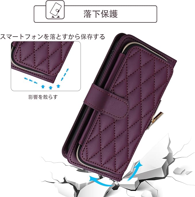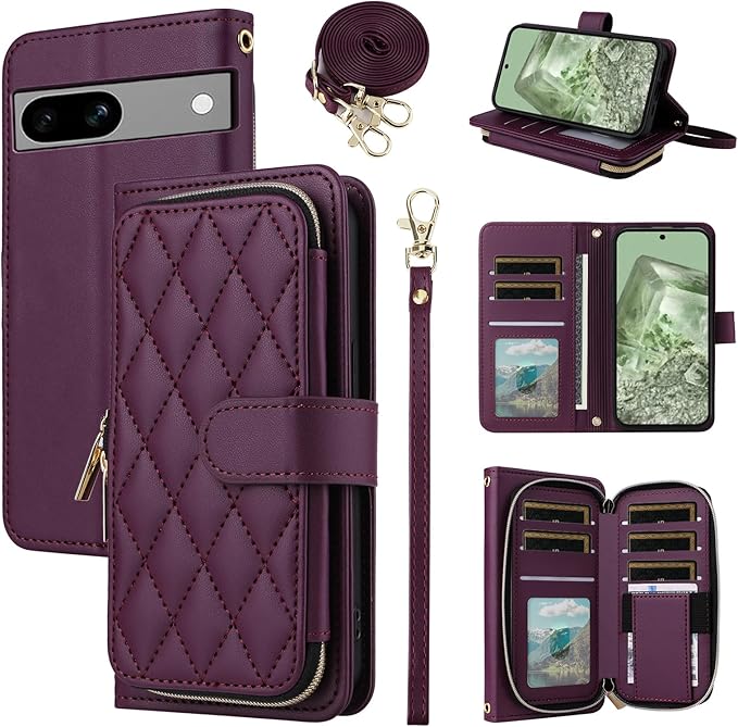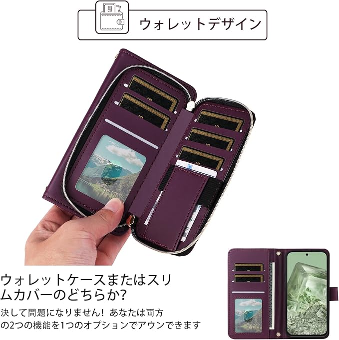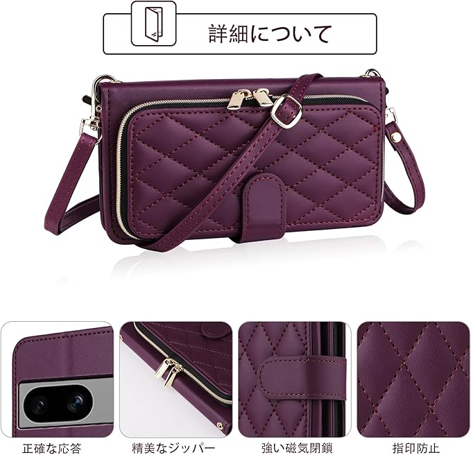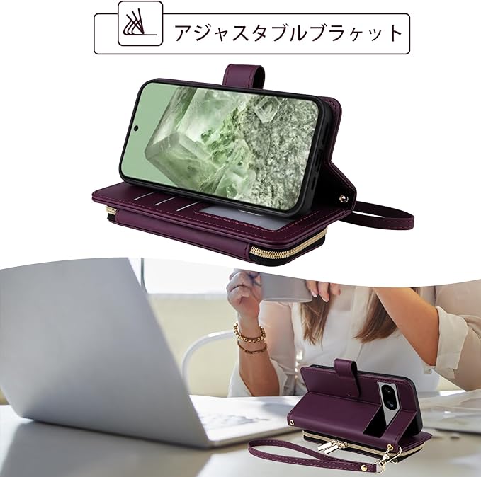 Elisorli for Google Pixel 8A 手首/ショルダーストラップ カードスロット ジッパー財布 豪華 PUレザー スタンド ための 携帯電話のカバー 持つ Pixel8A A8 5G ウォレットケース しい 大人人気 お洒落 ケース 手帳型 スマホケース カバー スマートフォン 耐久性 耐衝撃 フラップ ストラップホール カード収納 女 濃い紫
