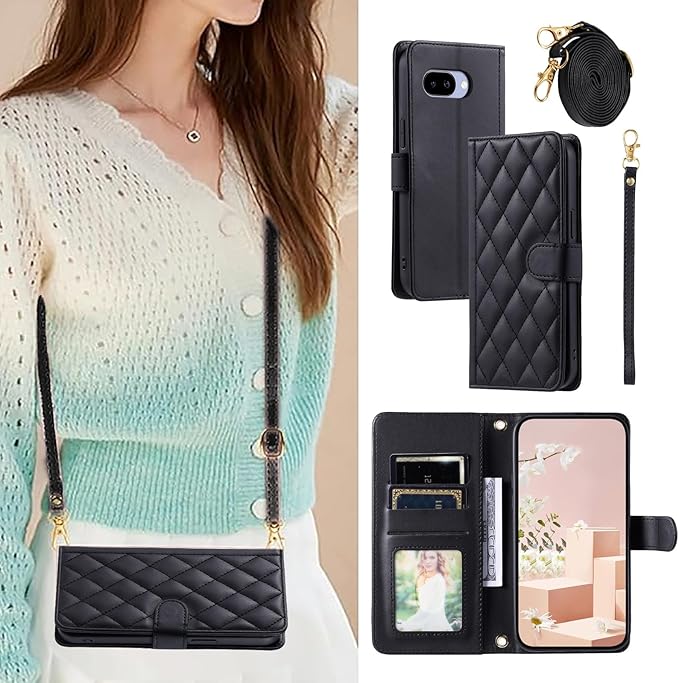 For ピクセル9Aケース 手帳型 ショルダー Pixel9Aケース 財布型 ストラップ カード収納 スマホケース グーグルピクセル9A 携帯カバー Googleピクセル9A ぐーくるぴくせる9A カバー 肩掛け 斜め掛け スタンド機能 グーグルピクセル9Aケース ピクセル 9A カード ピクシル9A手帳型 全面保護 耐衝撃 おしゃれ - ブラック