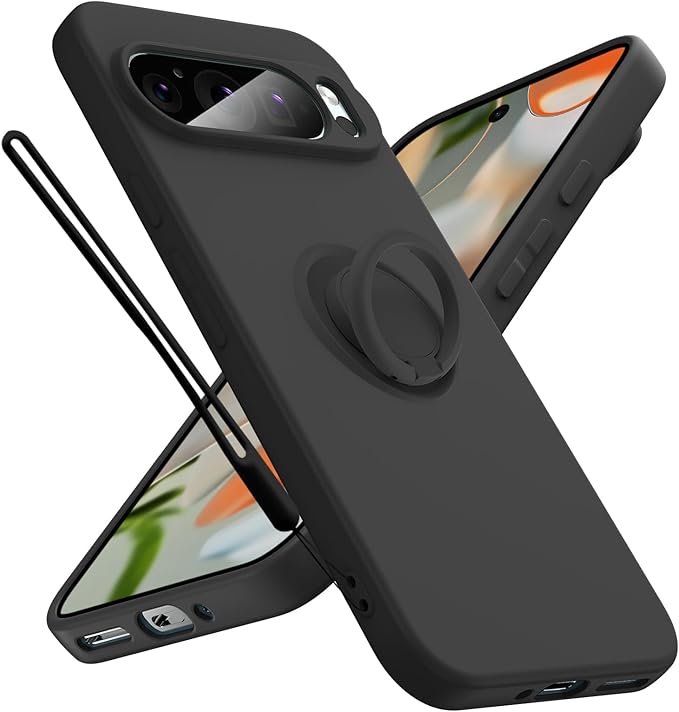 対応 Google Pixel 9 Pro XL 用 ケース リング ストラップ付き ストラップホール付き ソフト シリコン ケース おしゃれ 耐衝撃 軽量 薄型 スタンド機能 車載ホルダー対応 ピクセル 9 プロ XL 携帯カバー 黒 R-YTDS-GP9PXL-07-CP