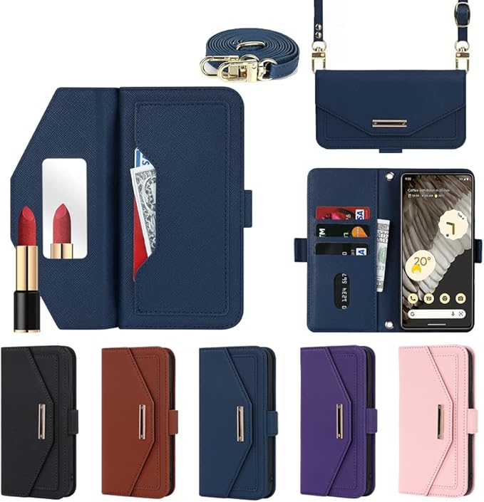 Eastwave for Google Pixel 7 Pro ケース for Pixel7 Pro 縄掛けカバー 手帳型 手帳 for pixel 7pro case チェック柄 鏡 ミラー付き 長ストラップ付き 肩掛け 革レザー 柔らかいTPU 多機能 財布型 カード収納 小銭入 れ スタンド機能 全面保護 5色ブルー